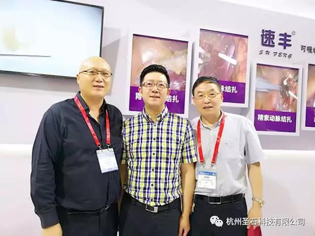 河南省醫學會微創外科分會新老主任委員河南省人民醫院微創中心主任張超教授及武警河南總隊醫院普外科主任趙國強教授也特意到訪我司展臺,與我司石磊董事長合影,表達對代表國貨優質產品速豐?的認可與支持。